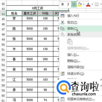 选中工资表表头,右击鼠标,弹出菜单选择复制,把此表头复制出来。