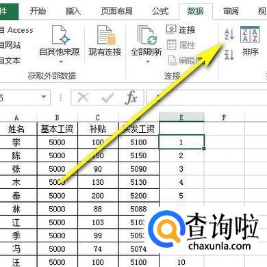 选中E45这个单元格,鼠标再点开数据选项卡,再点升序的按钮。