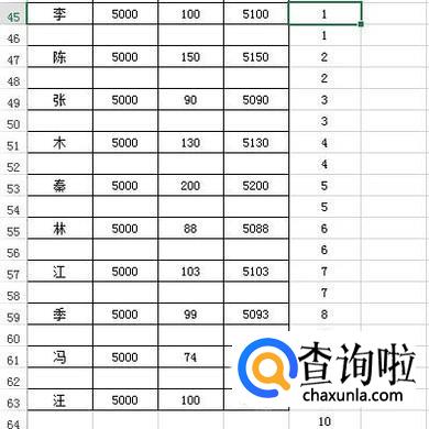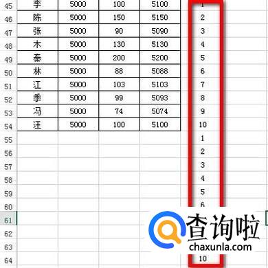 在E45:E54这区域单元格中,输入1到10的自然数。再在E55:E64这里同样输入1到10的自然数