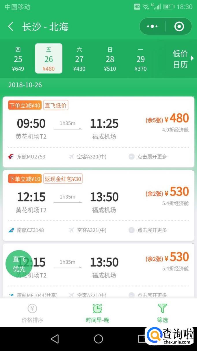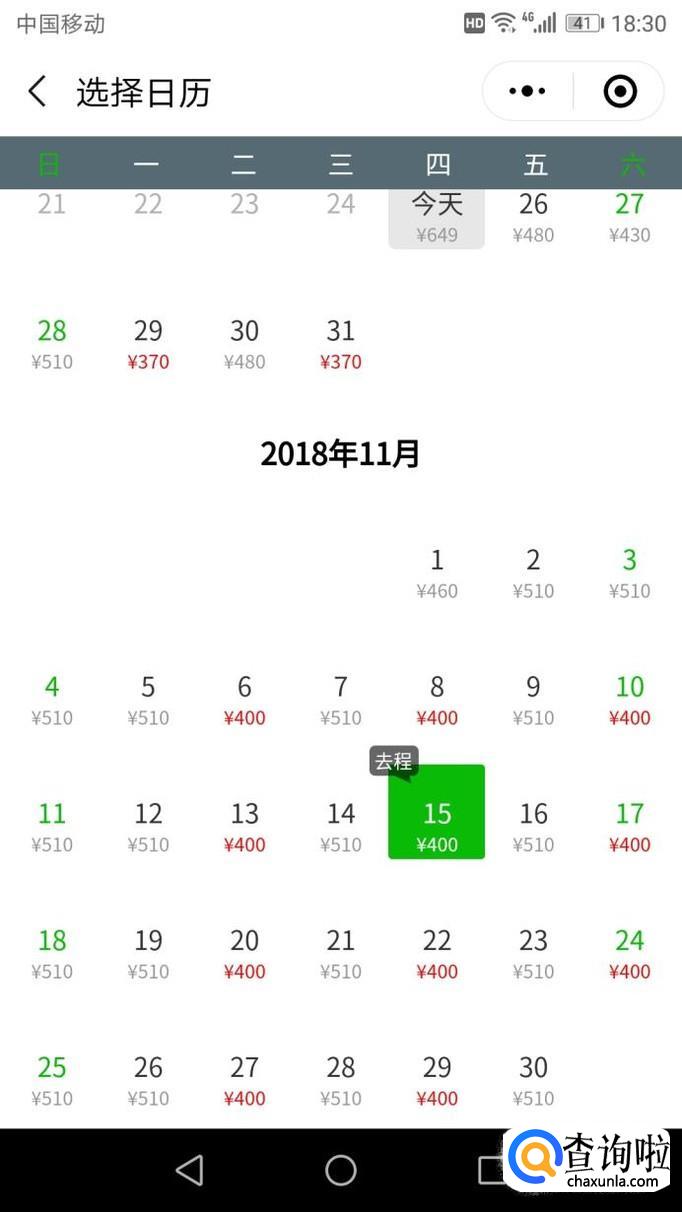 进入“低价日历”后,可以看到里面的机票有很多不同日历不同的价格,显示红色的为低价机票。
