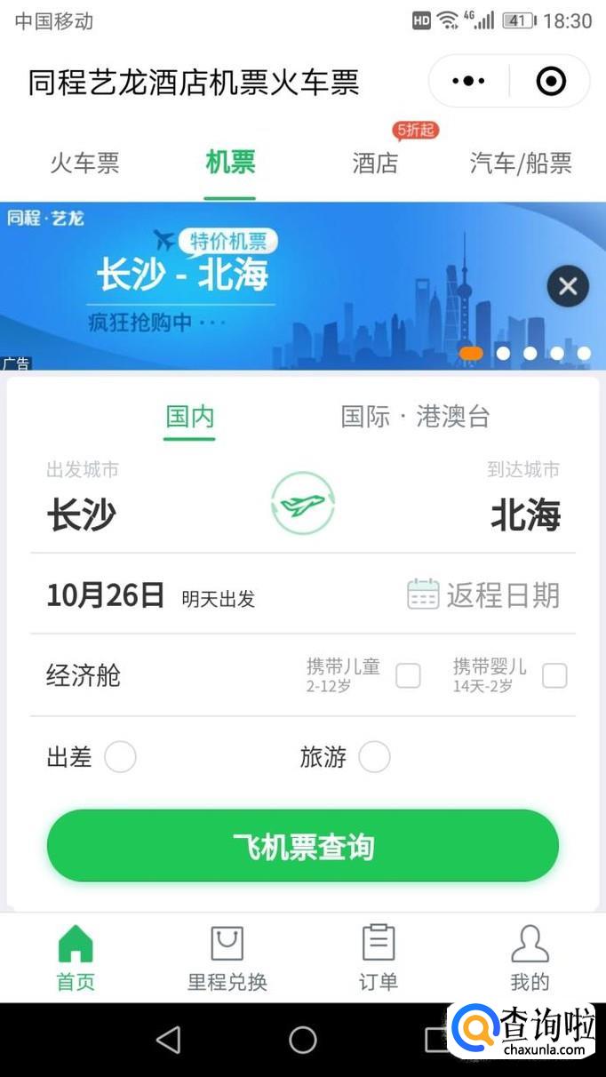进入“火车票机票”后,选择“机票”,输入起始地址进入飞机票查询。