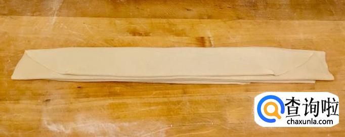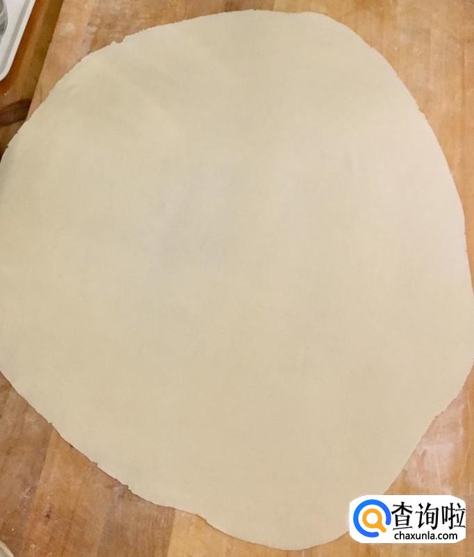 把面团擀压至能用擀面杖卷起即可,切记卷起前再铺撒一次干面粉