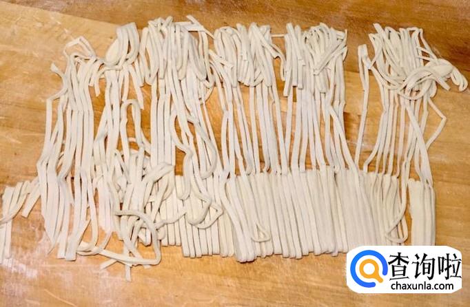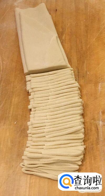 切好后把最上面两层向前翻开,握住面条一边撒干面粉一边轻轻抖散即可