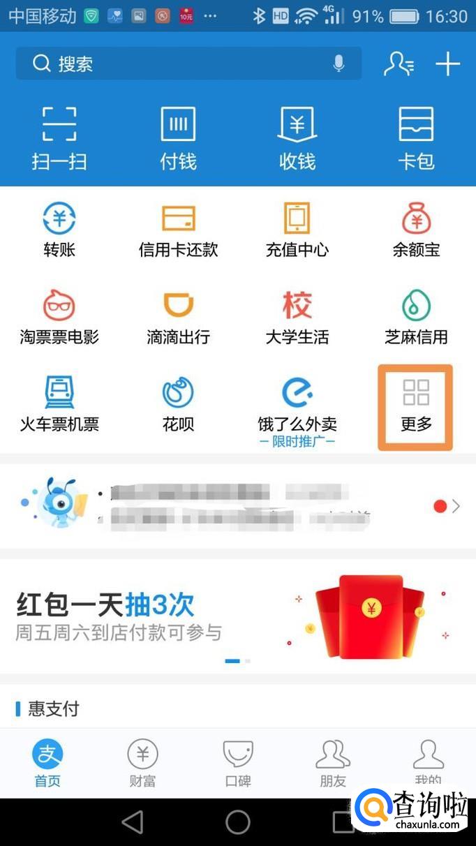 打开手机支付宝,在首页点击“更多”,进去之后点击便民生活中的“城市服务”。