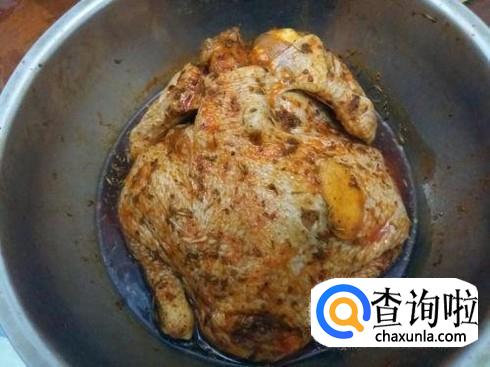 一些盐、料酒、生抽、还有一些生姜汁混合在一起,调匀之后用手抹在鸡身上,鸡肚子也要全部擦一遍。