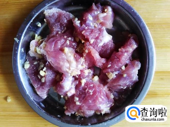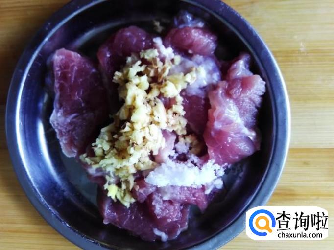 瘦肉切成薄片,加适量的盐、姜蓉、1勺料酒腌制几分钟。