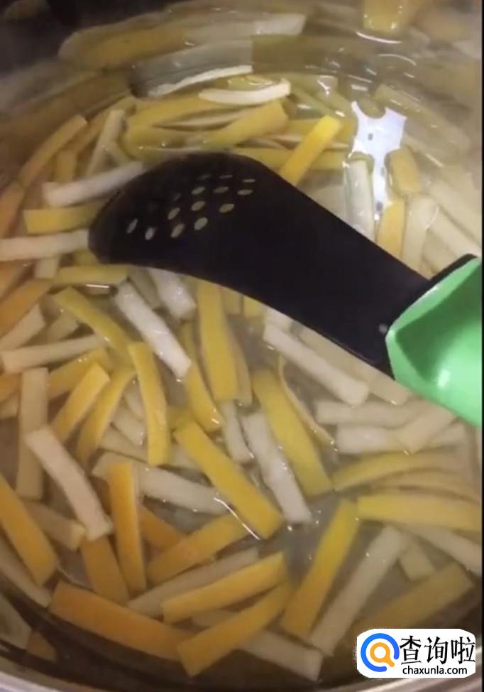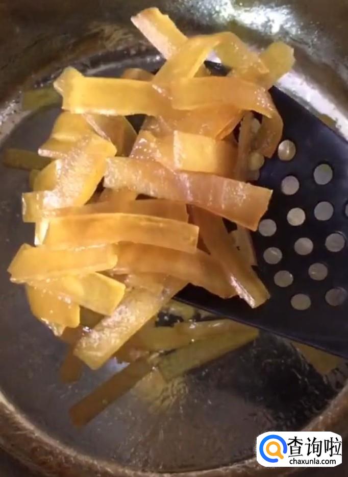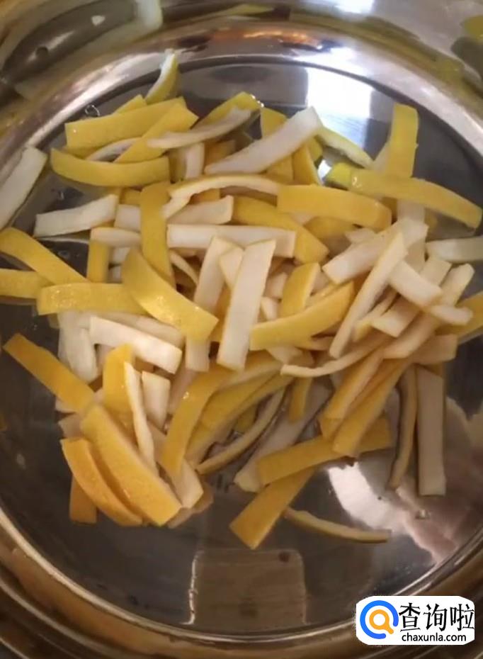 冲洗干净以后扒去外皮,用刀子把白色部分切除,只留下黄色部分