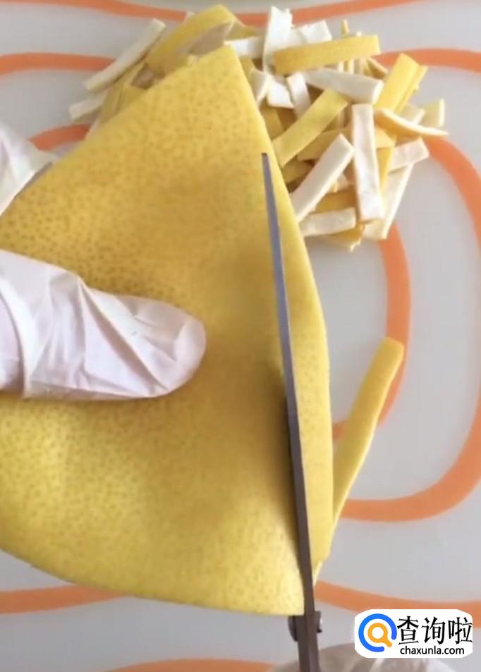 然后我们用剪刀把皮剪成长条,放入一个碗中