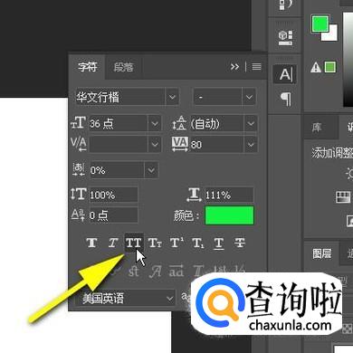 弹出字符面板。可以看到“全部大写字母”这个按钮呈激活状态。所以,在输入字母时总是以大写样式显示。那么,我们用鼠标再点击一次“全部大写字母”这个按钮,取消这个状态。
