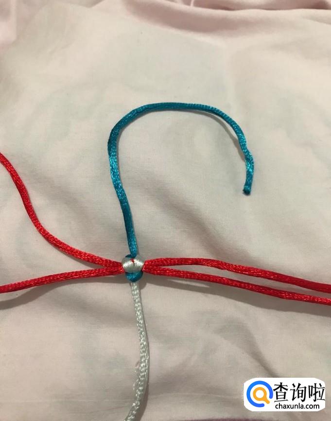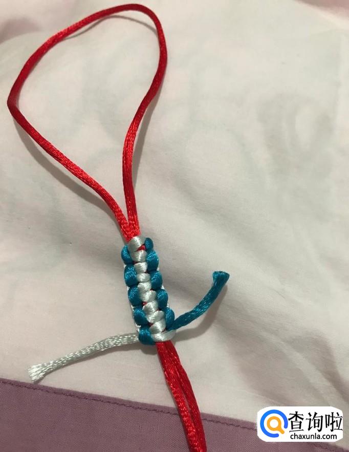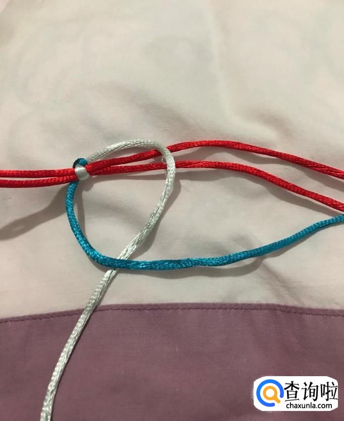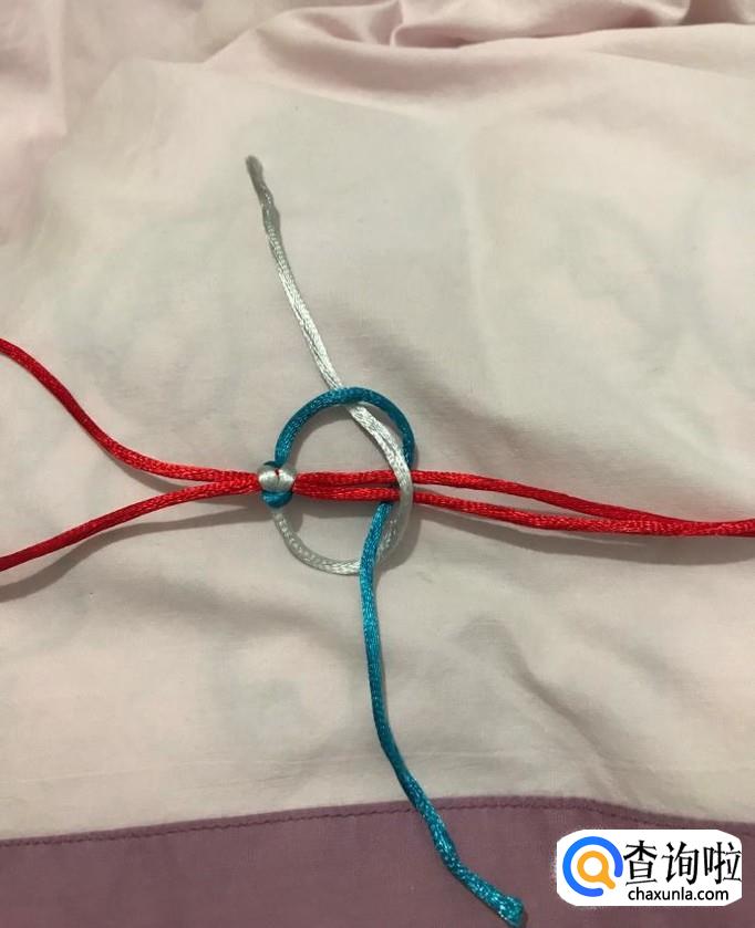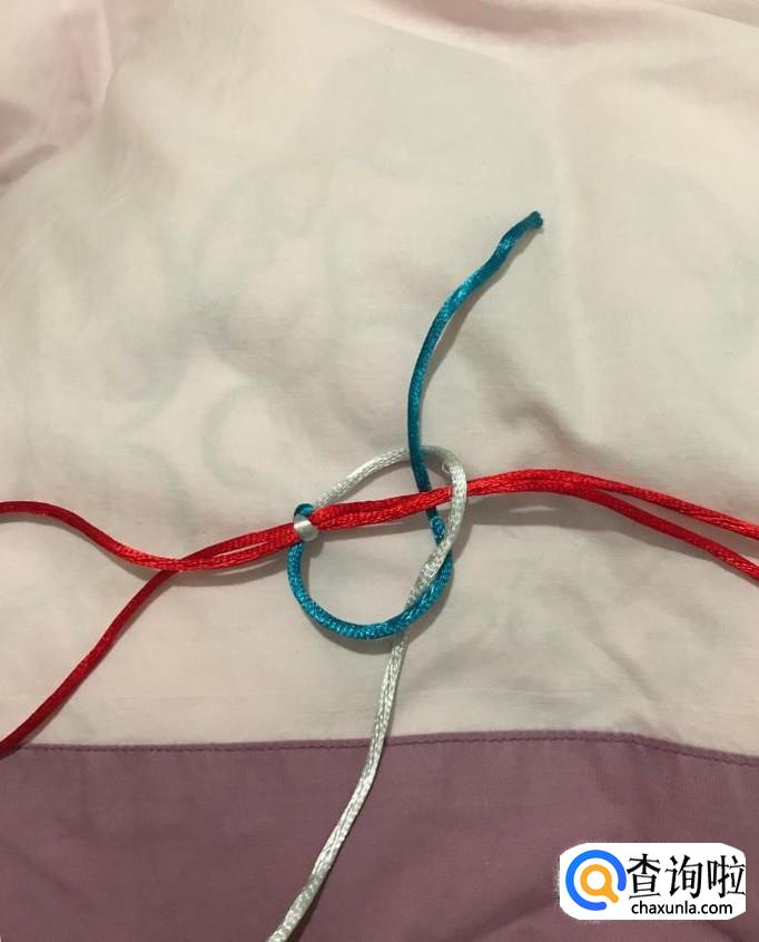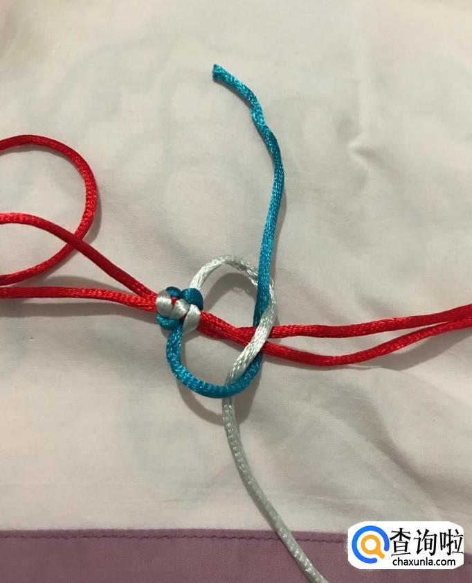 接下来,重复以上步骤,银线拉到上方,蓝线压住后绕到红线后面,从下方银线圈中穿出,调整、拉紧。