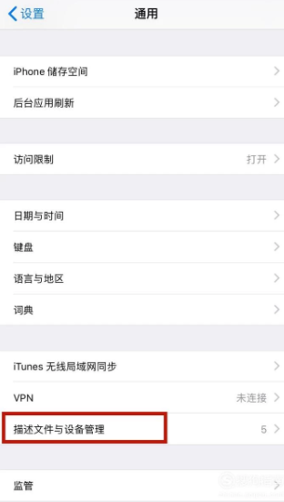 3、进入通用后,找到并点击“描述文件与设备管理” 如图所示。