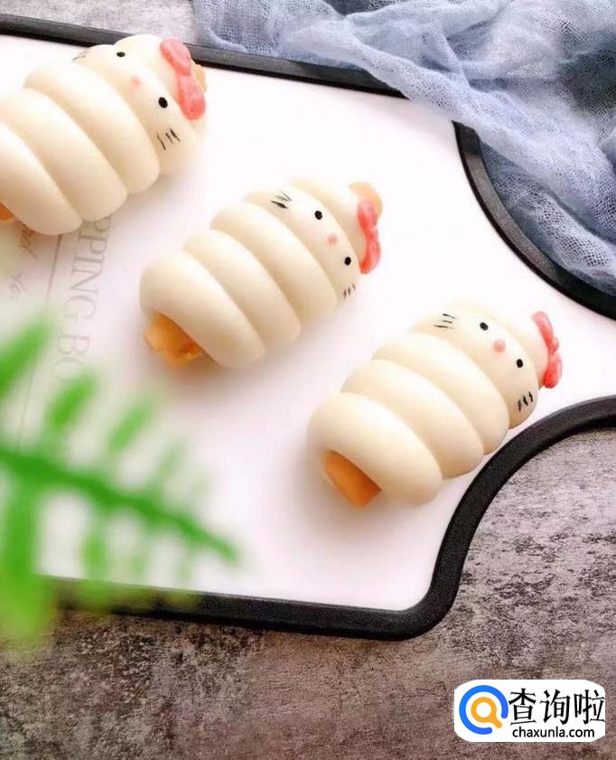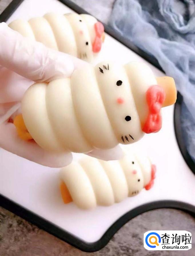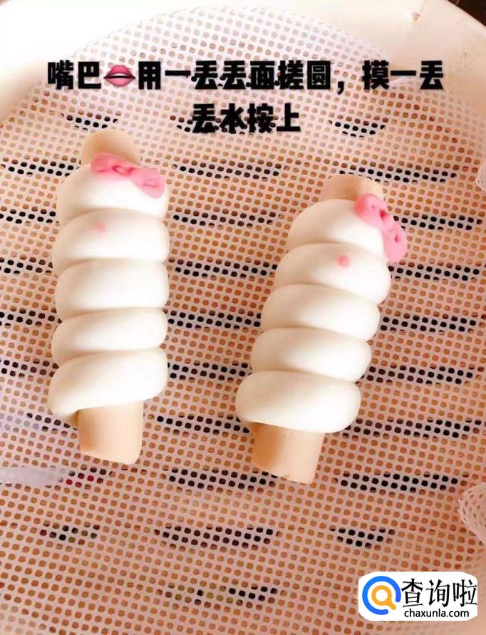 把做好的蝴蝶结按到面团上,如下图所示。小贴士:为了保证做出来的成品更加美观,大家可以把蝴蝶结按到香肠卷的一侧。