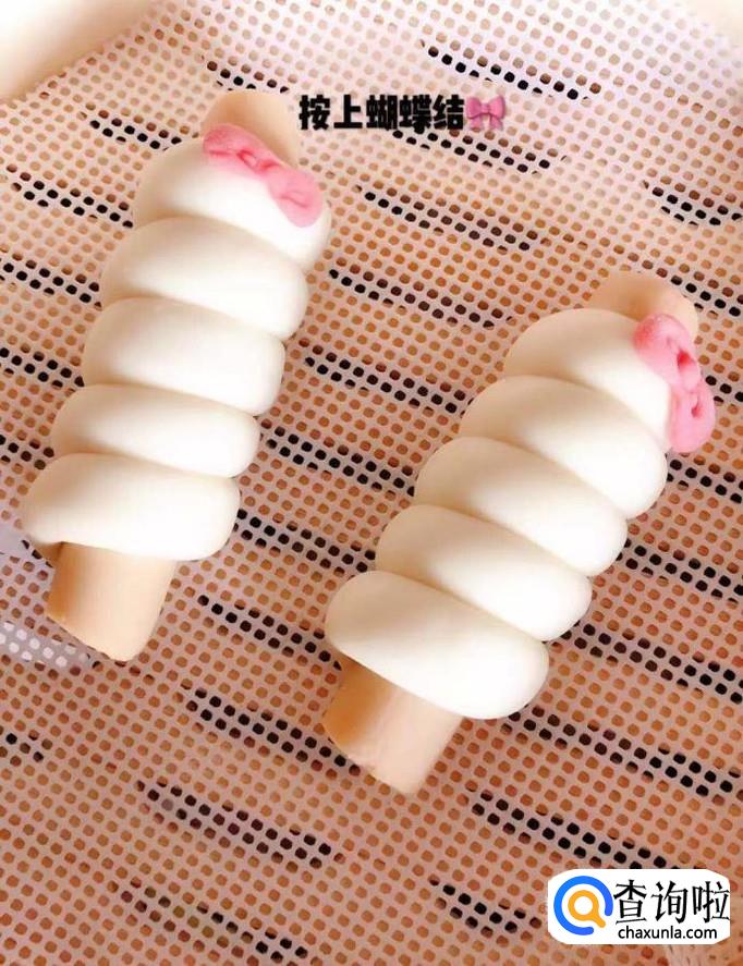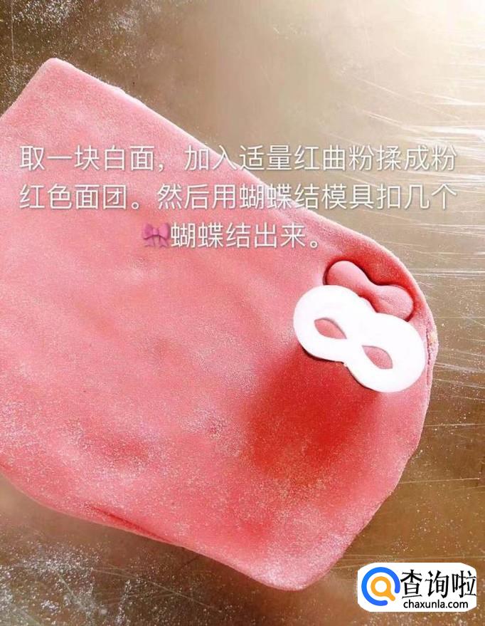 然后取一块白面,加入适量的红曲粉揉成粉红色面团,接着用蝴蝶结模具抠出几个蝴蝶结,如下图所示。