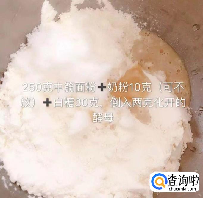 接着将250克的中筋面粉,10克的奶粉,30克的白糖,2克化开的酵母粉一起倒入盆中,搅拌均匀,如下图所示。