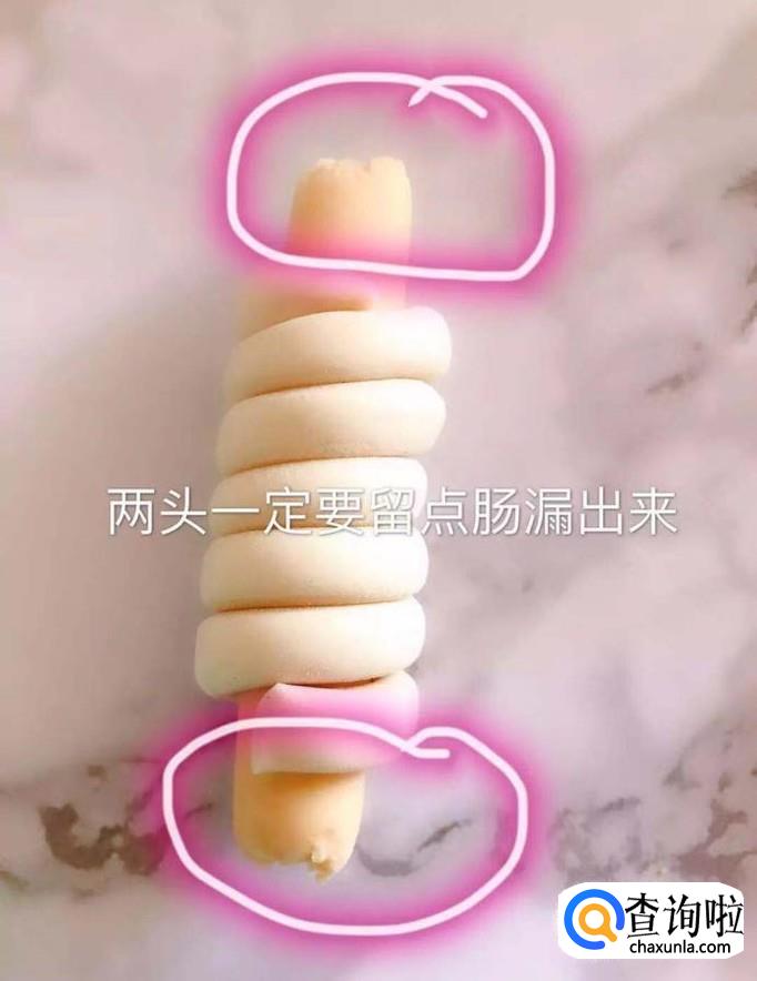 接着取一根香肠用面缠绕起来,如下图所示。小贴士:在缠绕香肠的过程当中,要留足足够的空间,大家可以参考1cm。