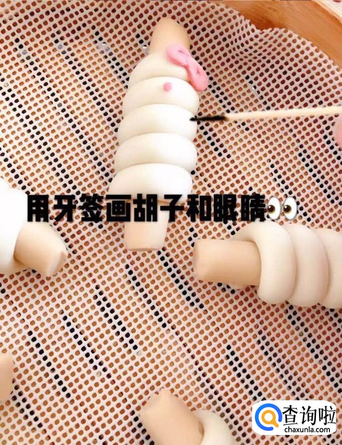 然后取适量的木炭粉和匀,用牙签画上胡子和眼睛,如下图所示。