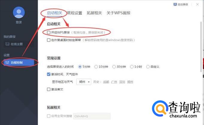 然后点击图标,出现如下界面,在“设置”的“功能控制”中的“启动相关”选项中有一条“开启WPS屏保”选项,然后将前面的对勾勾掉就可以了。