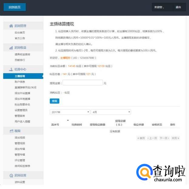 填写完毕我们的信息以后进入就算中心的主播提现,然后系统会自动把我们的余额算出来,我们只需要输入我们要提现的金额,然后点击提现就好了。