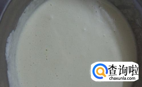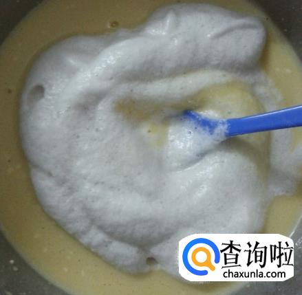 将打发的蛋白分二次加到刚才的蛋黄糊里,上下翻拌,切勿划圈,拌匀再加第二次,直到全部拌匀为止;之后用汤匙在拌好的蛋糕糊上划十字,另一手同时转动大碗,这样可以给蛋糕液消泡;如果你够耐心,也可以用牙签一个一个地把泡泡刺破。