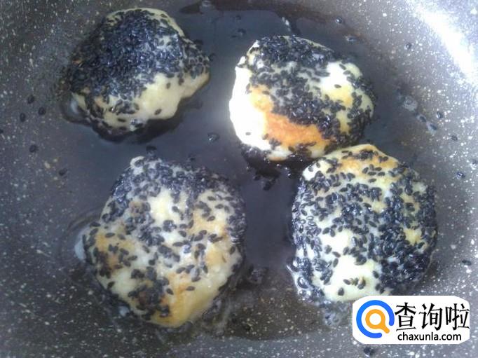 手湿一下水,然后抓适量的粉团揉搓成丸子再压成饼状,放到芝麻里粘满芝麻。
