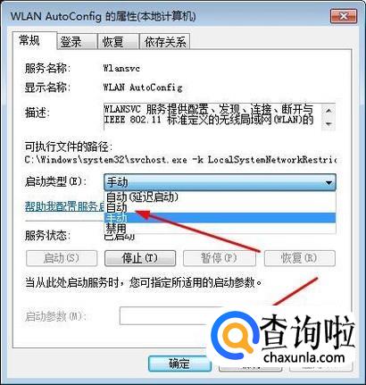 然后双击就可以打开其属性,我们将“手动”更改为“自动”然后点击确定,关闭所以窗口。然后我们点击右下角的网络链接图标就可以搜索到无线信号了。