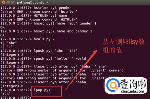 接下来我们来看一下怎么取出list数组里面的值,如下图所示,通过lpop命令就可以直接取出list里面的数组内容,这是从左侧开始取