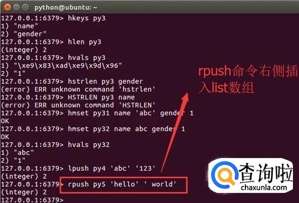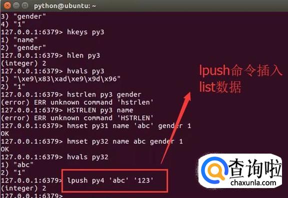首先打开Ubuntu命令行,在命令行中我们可以用lpush命令按从左往右的顺序插入一个list数组,如下图所示