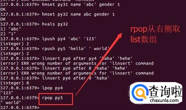 另外也可以通过rpop命令从右侧开始取list数组的值,如下图所示