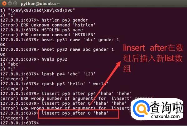 然后我们可以通过linsert after命令在某个数组后面插入新的list数组,如下图所示