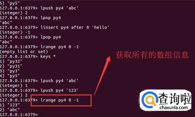 如果想取出list里面的所有数组内容,可以通过lrange命令提取,如下图所示,最后一个一个数字-1代表全部取出