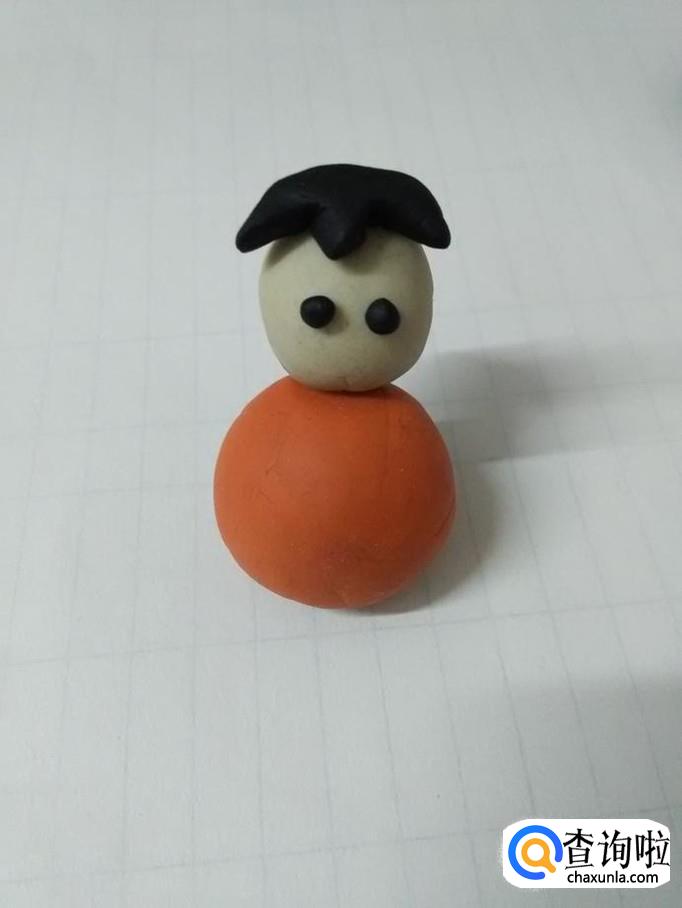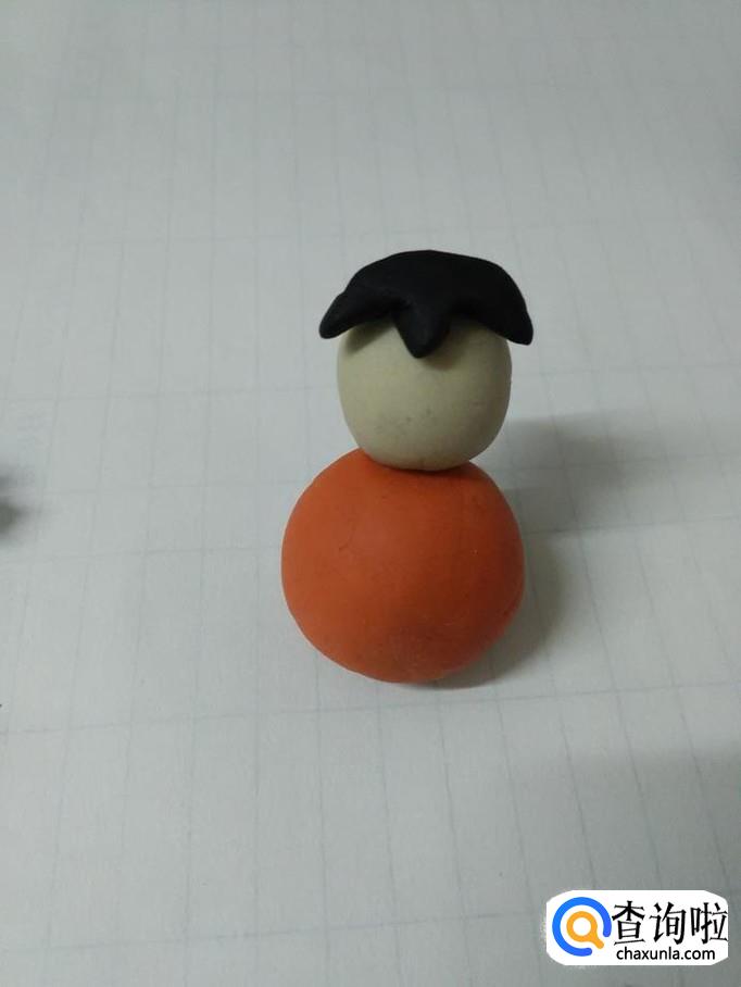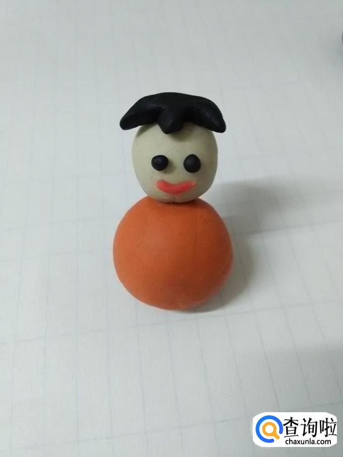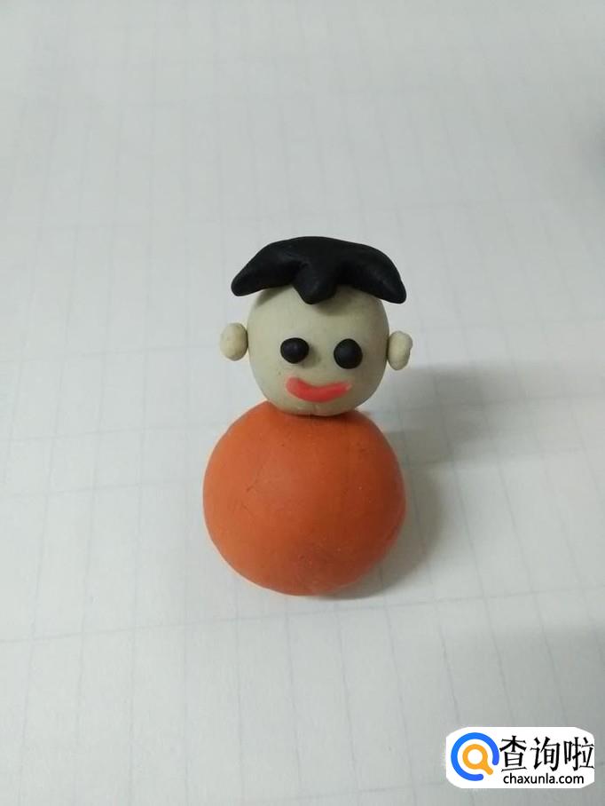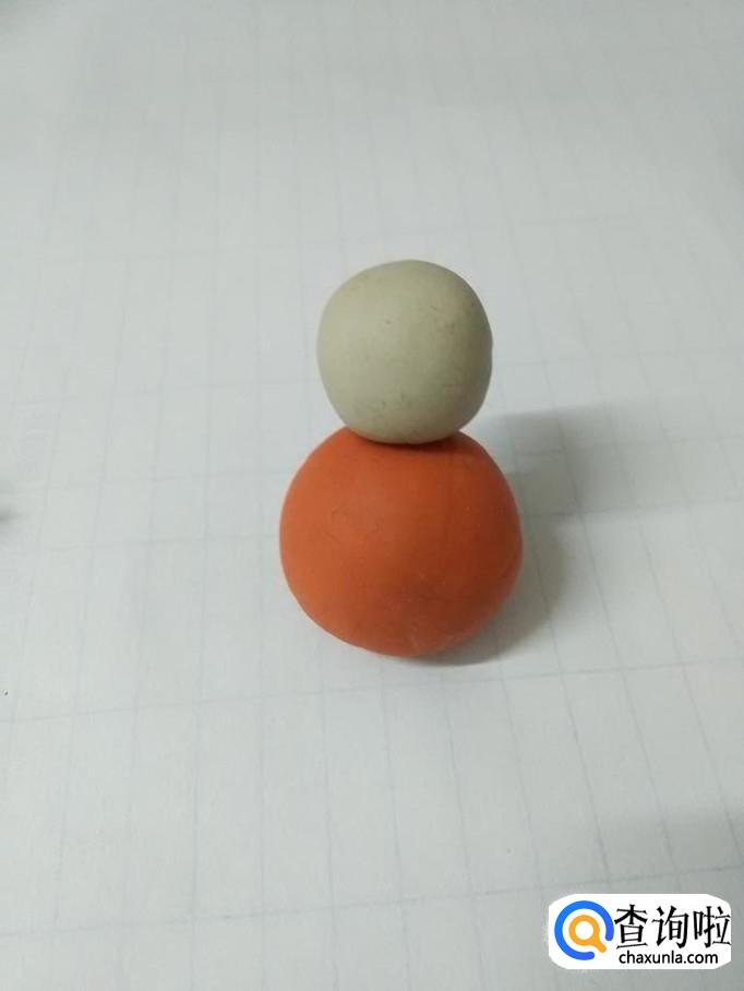 再用一块白色揉成又圆又光滑的圆球,粘在橘红色圆球上面,当做小娃娃的头。