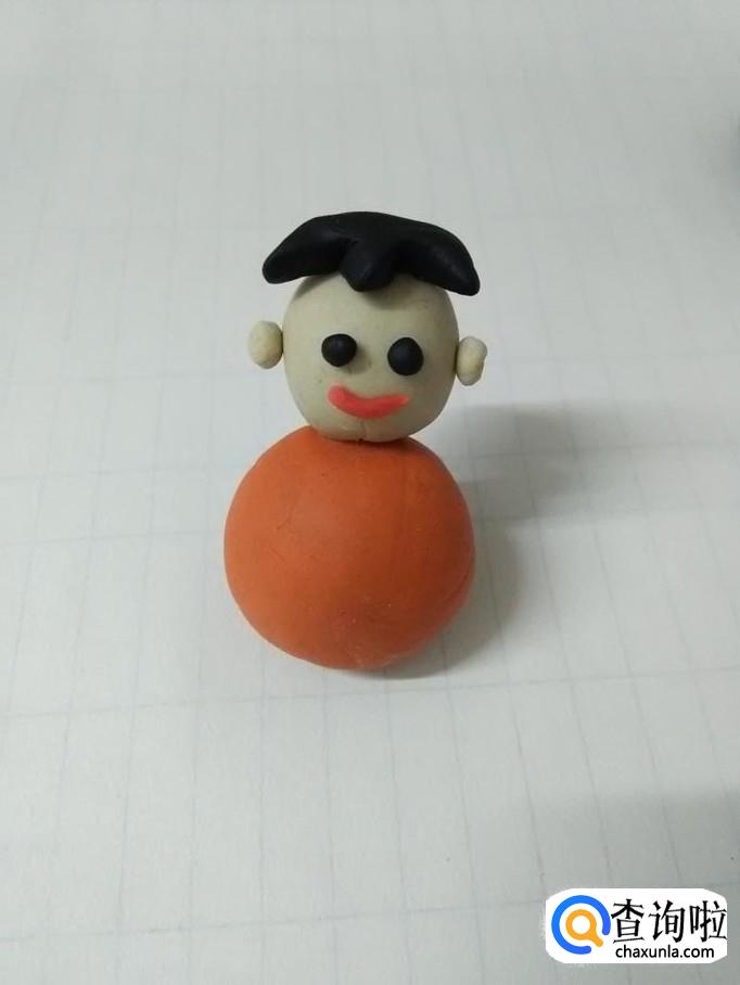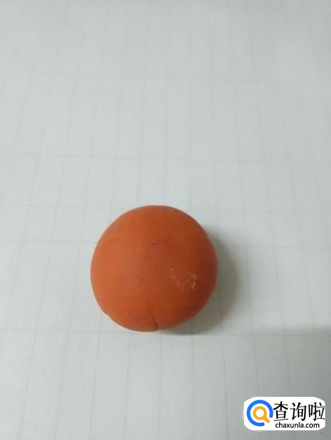 先将一块橘红色橡皮泥在手里揉成又圆又光滑的球,当做小娃娃的身体。