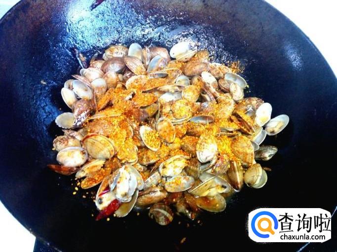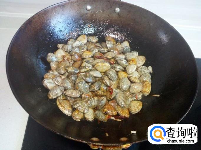 调料翻炒成汁后,放入花蚬子大火快速翻炒。