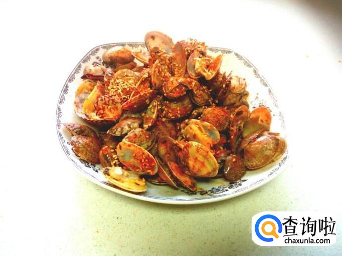 炒至花蚬子完全张口后,立即关火(不要炒老)。放入烧烤调味料,颠勺翻两下,盛盘(也可以盛盘后再放入烧烤调味料,这样放可以使烧烤调味料均匀,更好的入味)。