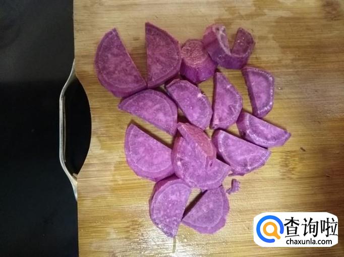 先将紫薯切两半,再切1厘米厚的切片;
