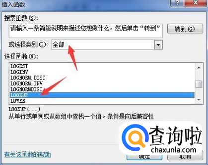 弹出插入函数对话框,接下来选择类别为全部,在下方的列表框中找到Lookup函数,点击确定。