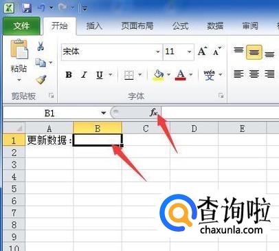 首先,打开Excel2010,在要显示更新数据的单元格处点击,再点击插入函数按钮fx。