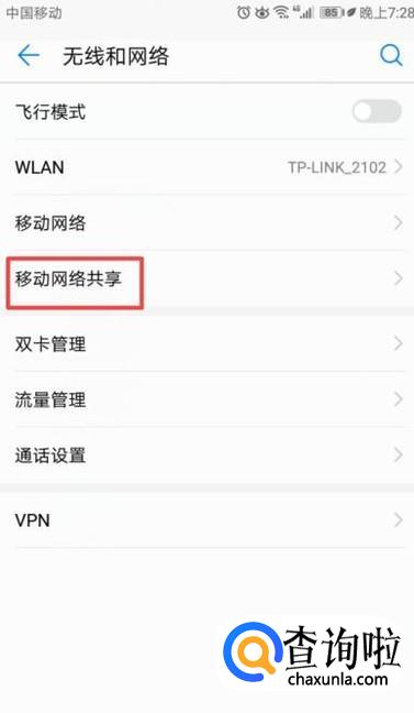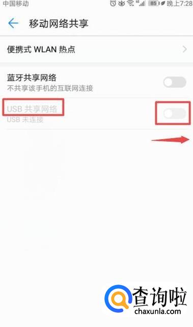之后我们可以在弹出的界面中找到USB网络共享,我们需要将USB接线插入电脑上,然后我们将其开关向右滑动打开就可以了。