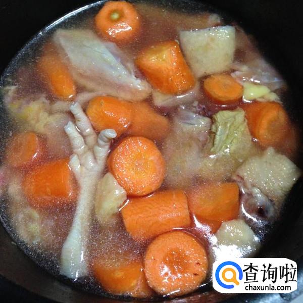 四十分钟后,打开盖子用筷子插一下鸡肉,轻轻松松进去了就是鸡肉熟了,再把山药放进煲中,胡萝卜山药不需要煲太长时间,一般十五分钟就可以了。