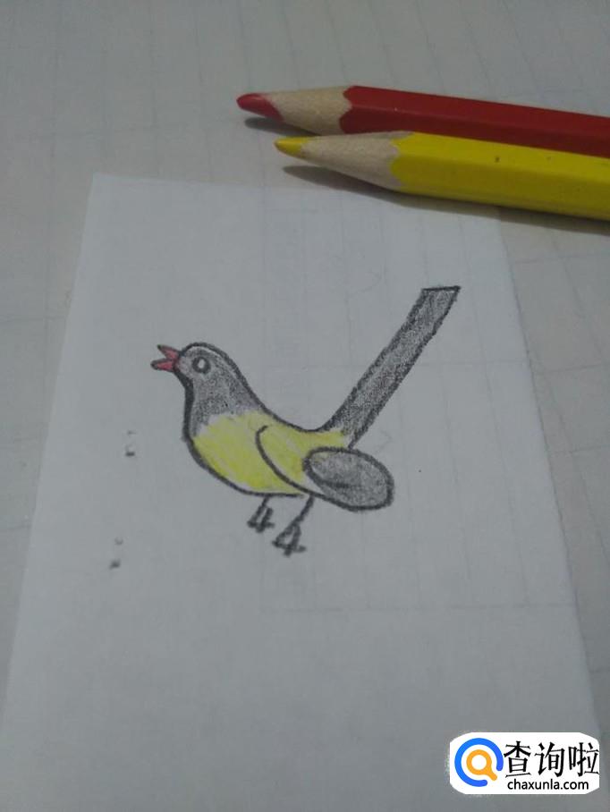 用黄笔将小喜鹊的肚子涂成黄色,再用红笔将小喜鹊的嘴涂成红色,一只彩色的小喜鹊就画完了。