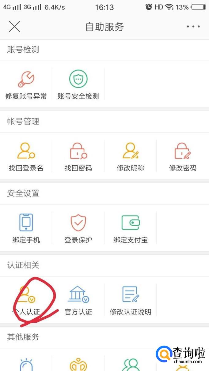 自助服务里有很多功能,在中间部分有“个人认证”这个选项,点击“个人认证”。