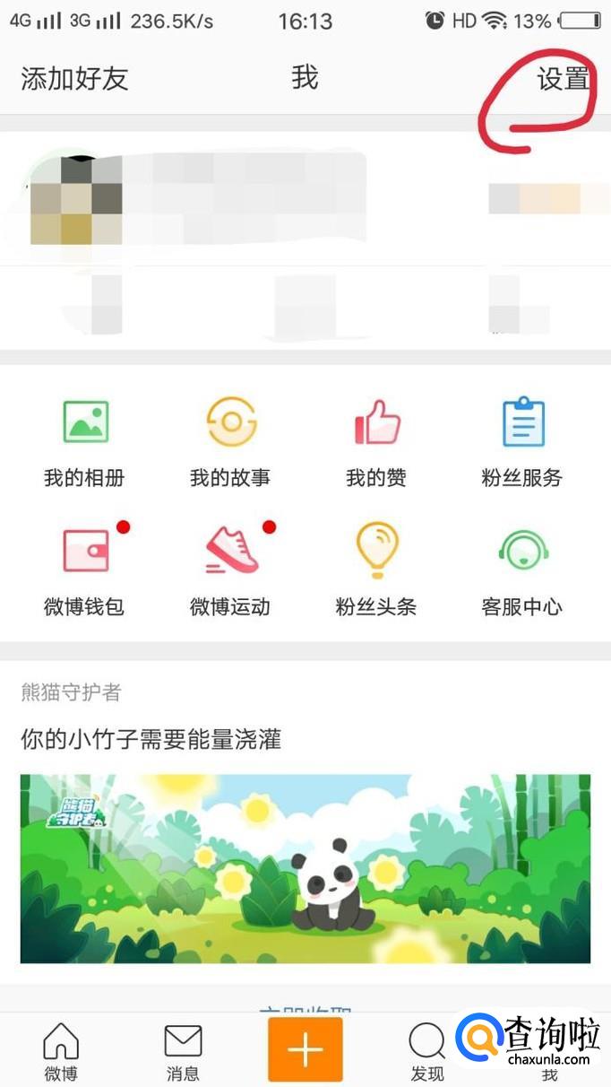 打开微博,点击右下角的“我”,进入到个人信息这个界面,点击右上角的“设置”。