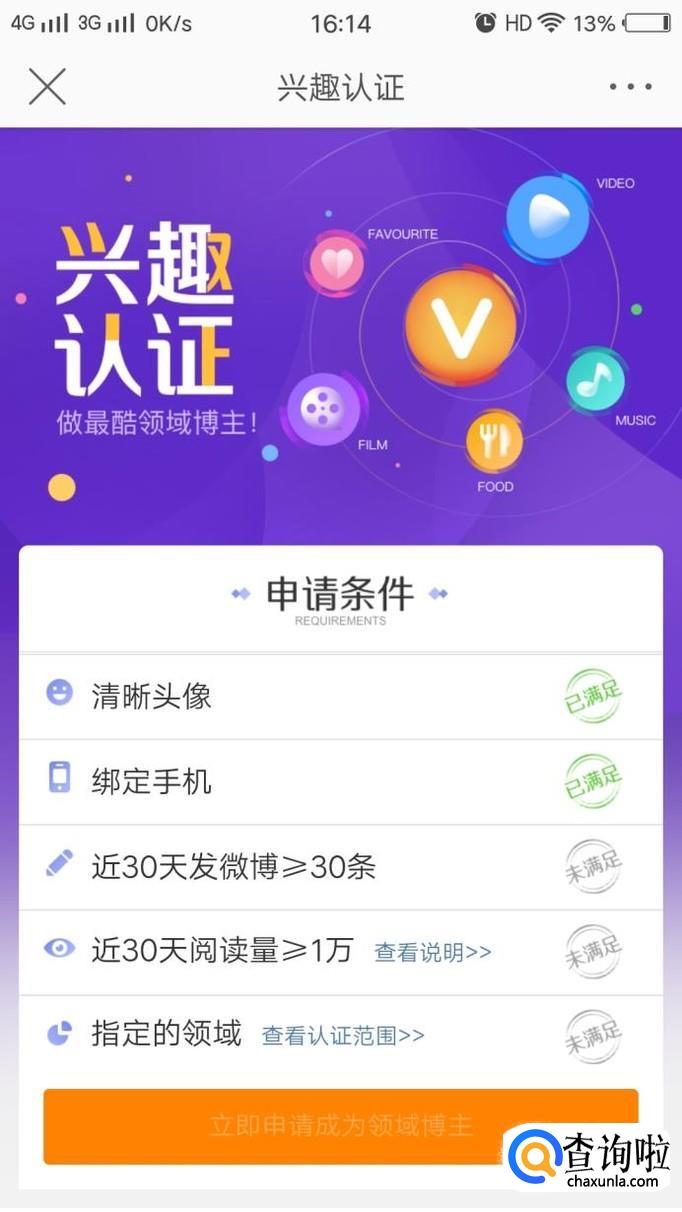 进入到个人认证后,可以看到有四种身份可以认证,点击自己想要认证的身份,以“兴趣认证”为例,点击它后会跳转到认证界面,如果你每一项资格都通过,即可点击橙色方框进行认证。