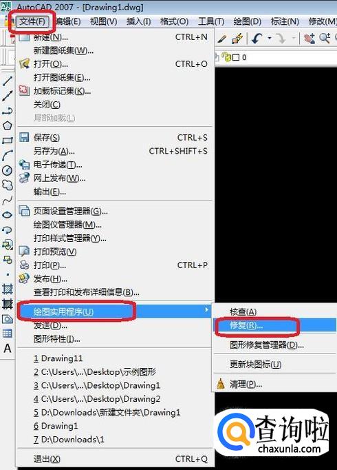 点击菜单栏“文件”,下拉菜单中选择“绘图实用程序”,可以看到扩展菜单中有“修复”选项,我们点击一下。