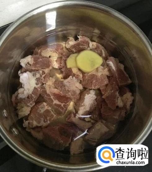 牛腩砍成小块,泡在加老姜,盐,料酒的温水中15分钟