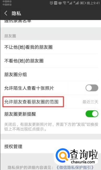 弹出的界面,我们点击允许朋友查看朋友圈的范围;