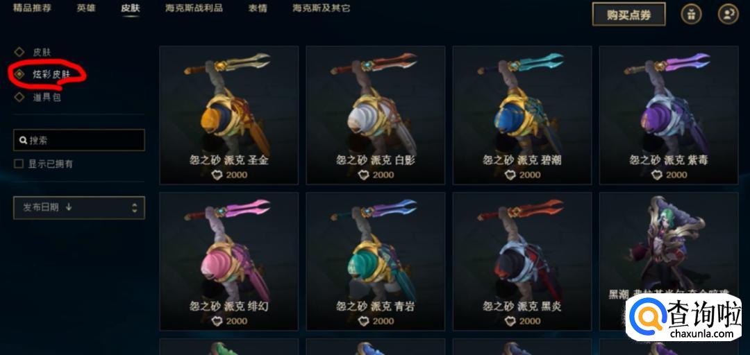 在电脑上登录游戏,在主页面点击“商城”,“皮肤”,“炫彩皮肤”。在此界面挑选你需要购买的炫彩皮肤即可。