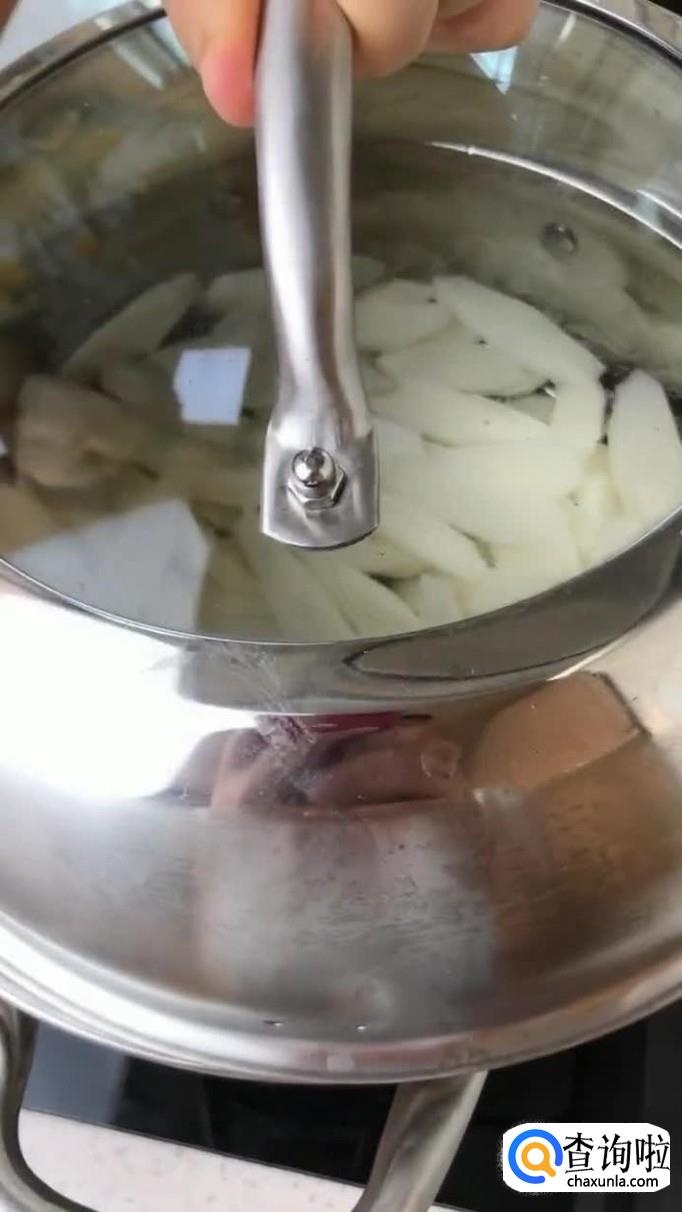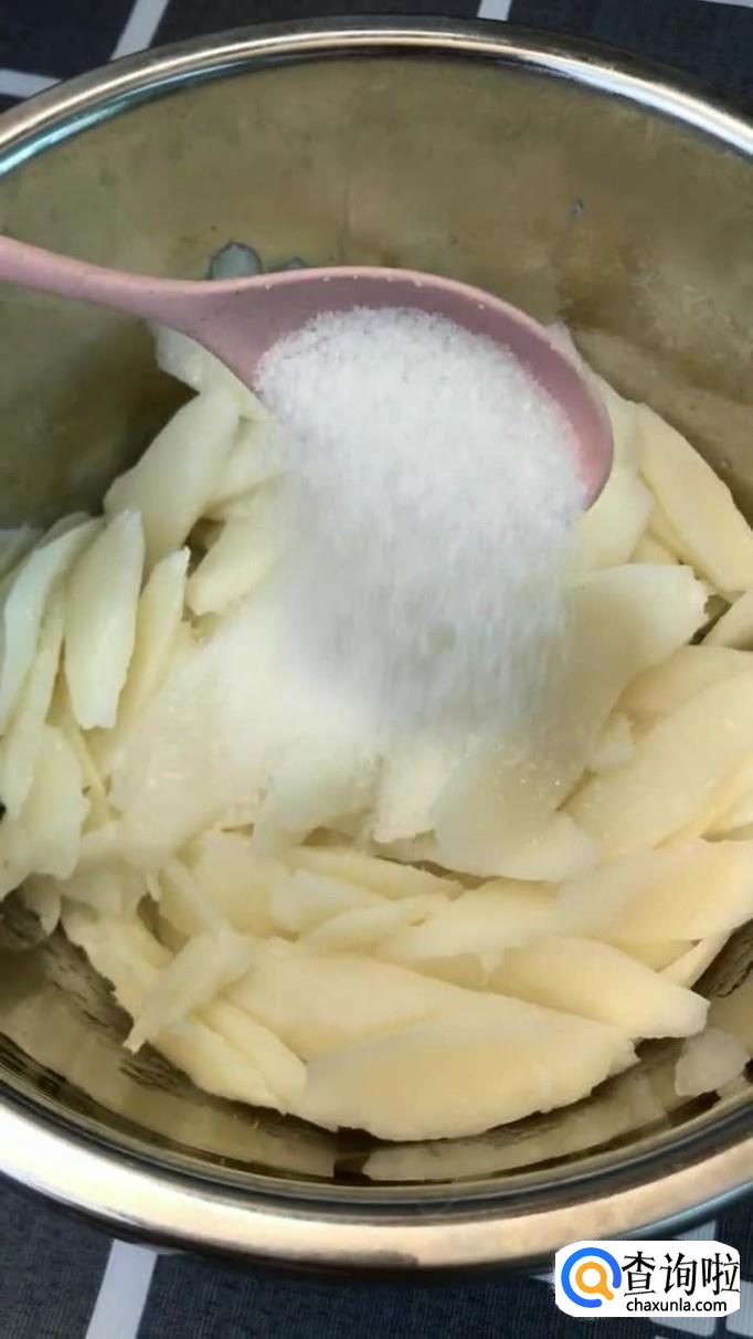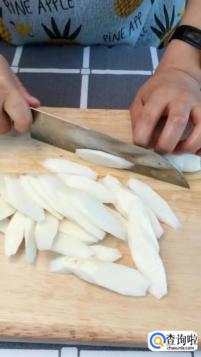 首先将山药去皮切成薄片,如下图所示。关于山药的选择,小编建议大家使用铁棍山药会比较好处理一些。另外小编要提醒大家的是,如果有小伙伴皮肤容易过敏,最好带上一次性手套。