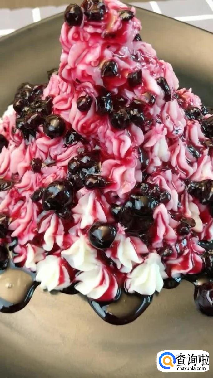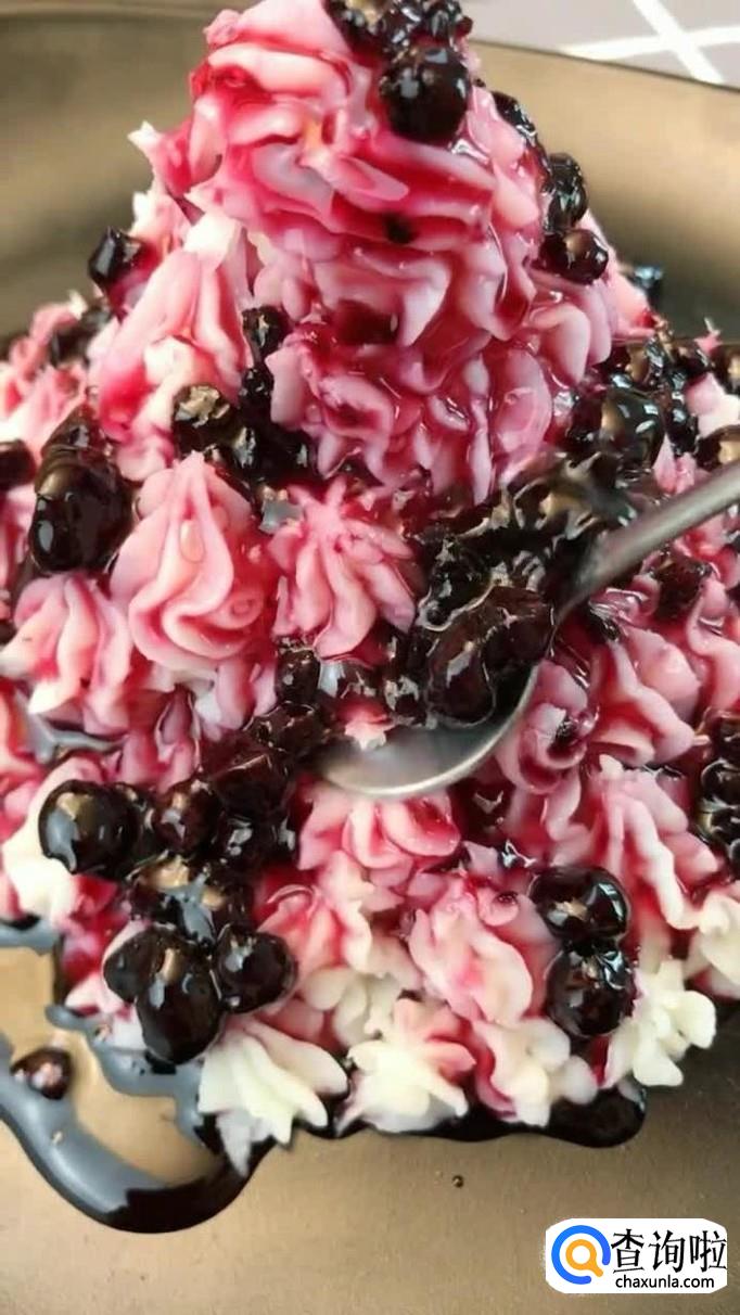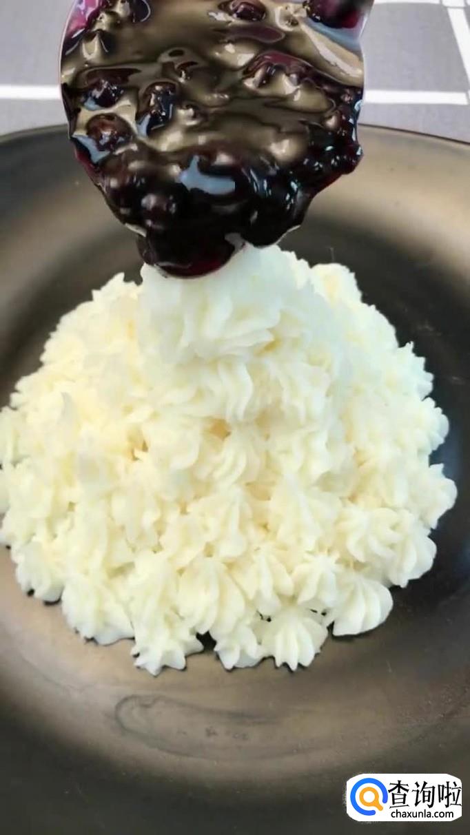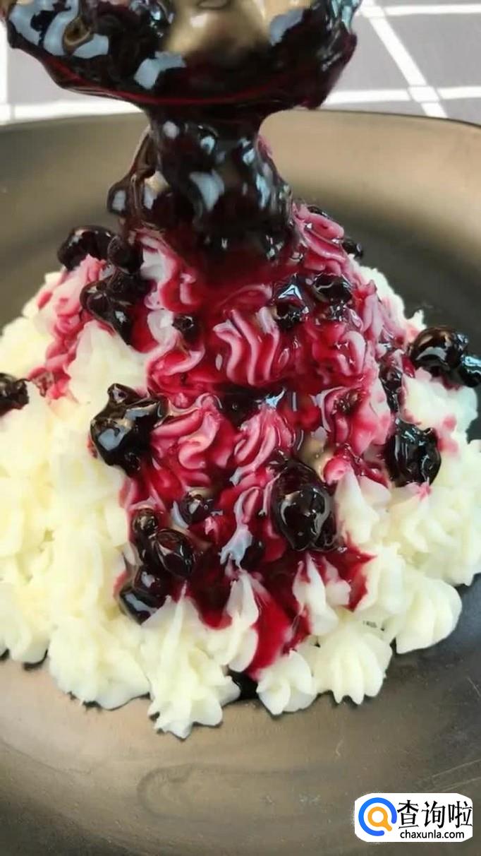 接着把处理好的蓝莓酱浇淋在冰激凌上,如下图所示。