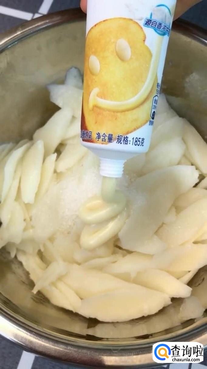 接着往蒸好的山药片中加入适量的白砂糖和炼乳,之后用擀面杖捣碎,如下图所示。注意山药捣的越碎越好。
